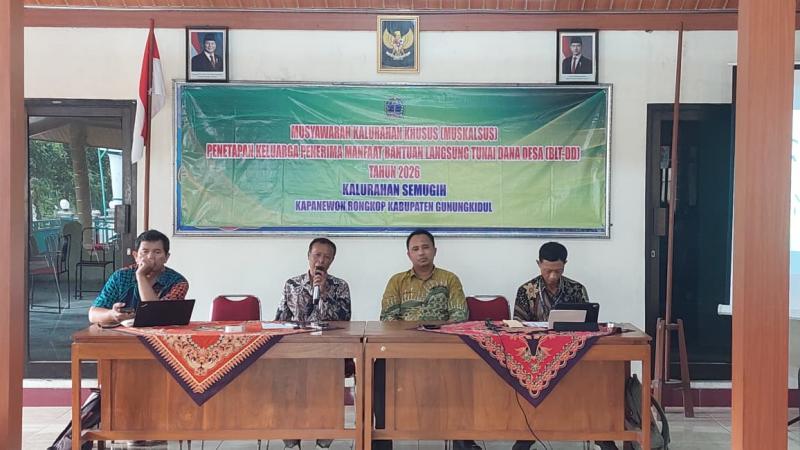 Jumat, 09 Januari 2026 pukul 13.00 WIB s/d selesai, telah dilaksanakan rapat Musyawarah Kalurahan Khusus (MUSKALSUS) Penetapan Calon KPM BLT-DANA DESA Tahun Anggaran 2026 yang bertempat di Balai Kalurahan Semugih.