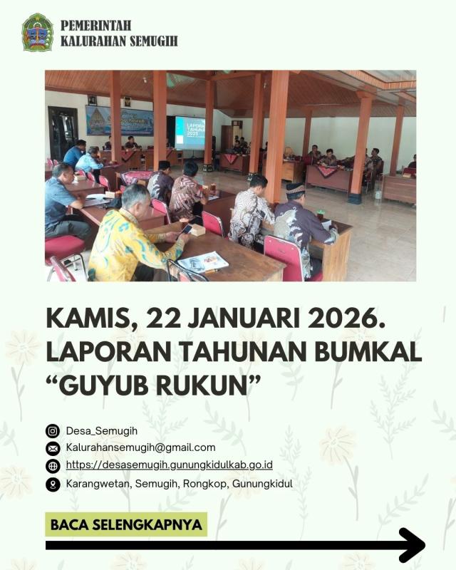 BUMKAL "GUYUB RUKUN" pada kamis 22 januari 2026, bertempat di kalurahan semugih melaksanakan rapat tahunan penyampaian hasil usaha dan perkembangan bumkal untuk tahun 2025.