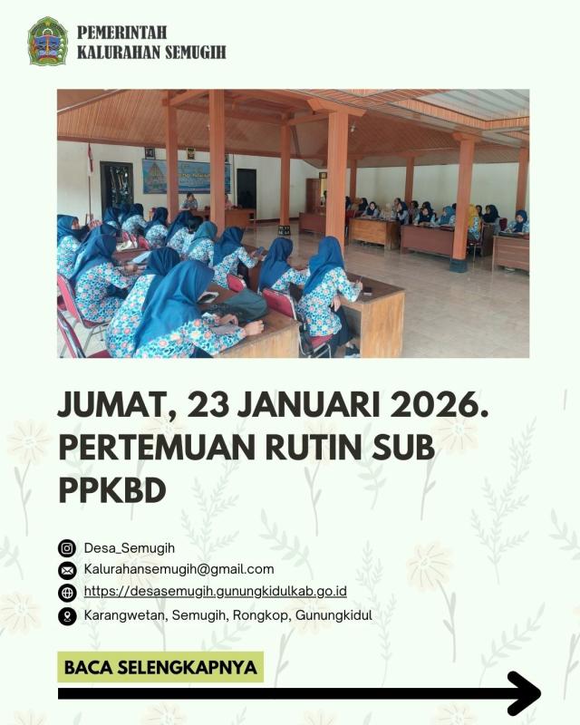 Kalarahan Semugih, Jumat 23 Januari 2026, melaksanakan pertemuan rutin Sub Pembantu Pembina Keluarga Berencana Desa (PPKBD), dalam acara ini dari kalurahan semugih yang menyambut adalah bapak Suparsa selaku Kamituwa, beliau menyampaikan bahwa insentif kader tahun ini naik dari 50.000 menjadi 65.000.