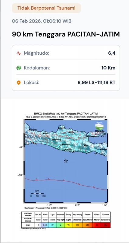 Kalurahan Semugih ( Jumat, 06 Februari 2026 ) - Gempa bumi tektonik berkekuatan magnitudo 6,5 mengguncang wilayah selatan Pulau Jawa pada Jumat (06/02/2026) dini hari, sekitar pukul 01.06 WIB. Informasi tersebut disampaikan resmi oleh Badan Meteorologi, Klimatologi, dan Geofisika (BMKG).