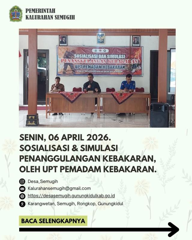 Senin, 06 April 2026 - Unit Pelaksana Teknis Pemadam Kebakaran Badan Penanggulangan Bencana Daerah melaksanakan sosialisasi dan simulasi penanggulangan kebakaran di Kalurahan Semugih yang masuk pada putaran ke tiga.