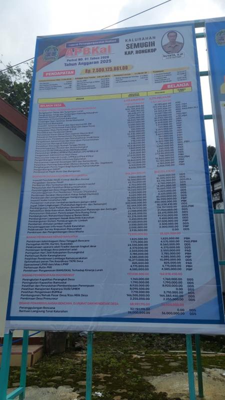 Senin, 06 April 2026 - Sebagai bentuk transparansi dalam pengelolaan keuangan kalurahan, Pemerintah Kalurahan Semugih memasang baliho yang berisi Laporan Pertanggungjawaban Realisasi Pelaksanaan Anggaran Pendapatan dan Belanja Kalurahan (LPJ APBKal) Tahun Anggaran 2025 dan juga Anggaran Pendapatan dan Belanja Kalurahan Tahun Anggaran 2026 (APBKal 2026).