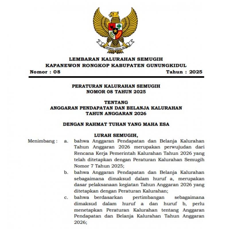 Kalurahan Semugih - Lurah Semugih Bersama Badan Permusyawaratan Kalurahan Semugih secara resmi telah menyepakati dan menerbitkan Peraturan Kalurahan Nomor 08 Tahun 2025 tentang Anggaran Pendapatan dan Belanja Kalurahan Semugih Tahun Anggaran 2026.