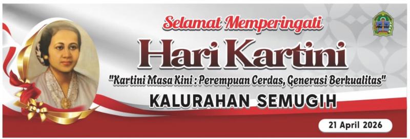 Selasa, 21 April 2026 - Kalurahan Semugih mengucapkan "Selamat Memperingati Hari Raya Kartini 21 April 2026". Mari kita teruskan perjuangan Raden Ajeng Kartini dalam mewujudkan kesetaraan, pendidikan, dan keadilan bagi seluruh perempuan Indonesia. Semangat pantang menyerah beliau selalu menjadi inspirasi kita. Jadilah perempuan tangguh, cerdas, dan mandiri yang mampu mengukir prestasi serta membawa perubahan positif bagi bangsa dan negara tercinta kita ini.
