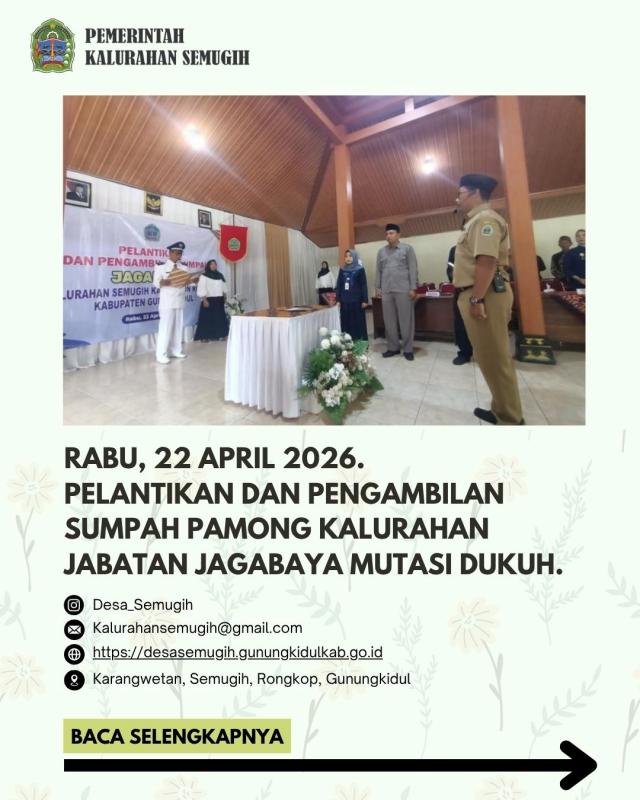 Rabu, 22 April 2026 - Kalurahan Semugih telak melaksanakan Pelantikan dan Pengambilan Sumpah Pamong Kalurahan dengan Jabatan Jagabaya, yang sebelumnya menjabat sabagai Dukuh Ploso, sehingga jabatan jagabaya kalurahan semugih kini per tanggal 22 april 2026 diisi oleh bpk Saqri Amsyori,S.I.P...